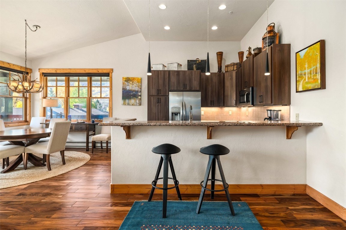 This top floor, corner unit at Sundance Creek welcomes you with high ceilings and abundant natural light. The acacia floors, updated cabinetry and floor to ceiling stone fireplace, give the home warmth and coziness, and a private deck off the dining space offers stunning views to Emerald Mountain and the ski area. As you walk down the hallway, you find the well-appointed full guest bathroom, a large storage closet as well as a utility/laundry space. The guest bedroom offers plentiful storage and light as well. Across the hallway you find the spacious primary bedroom with ensuite bathroom. Sundance Creek is within walking distance to shops, restaurants, Starbucks, the Core Trail and free bus stop. Enjoy everything Steamboat has to offer from a convenient location between Steamboat Ski Resort and downtown. The HOA takes care of exterior maintenance, snow removal, landscaping and a large hot tub. With your own finished garage with plenty of space for a vehicle and your toys, this beautifully updated home is not to be missed!